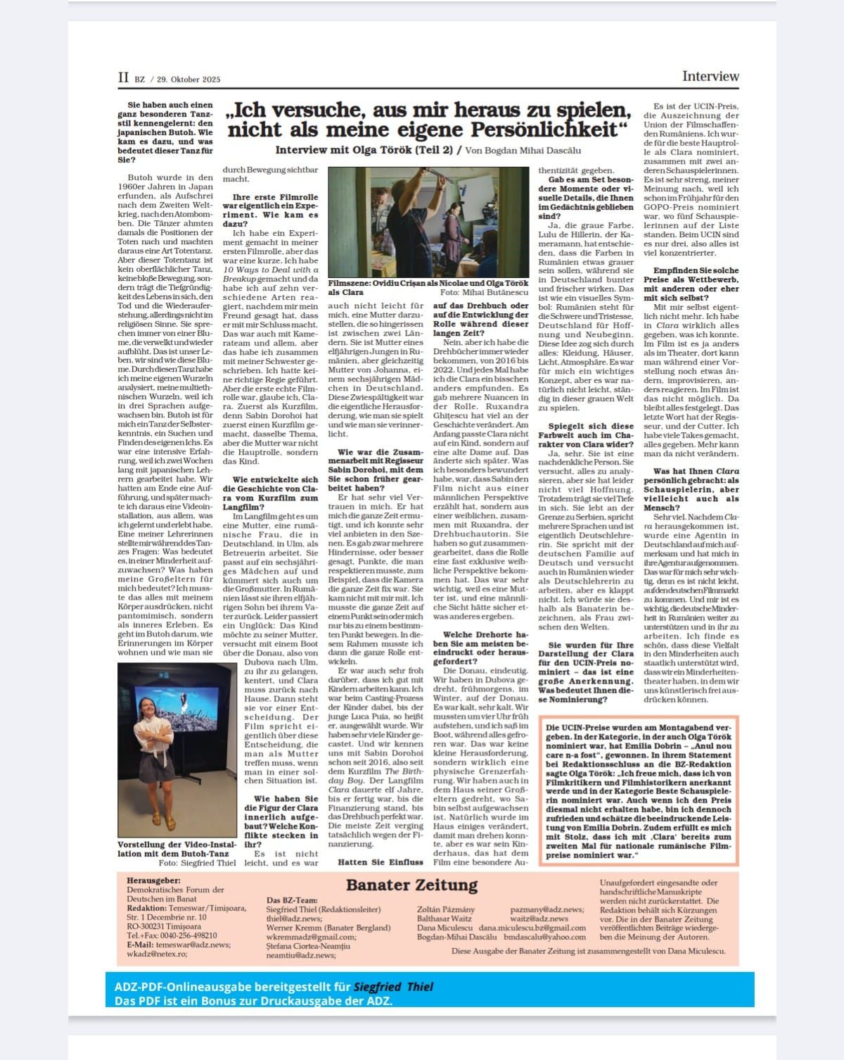 Prior to the nomination, I spoke about Clara and my work beyond the stage in two in-depth interviews. In the Banater Zeitung Temeswar, the second part of the interview focused on the film as well as on projects I have initiated outside the theatre context. My sincere thanks go to Siegfried Thiel and Bogdan Mihai Dascălu for this conversation.